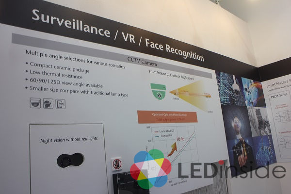本次展出的IRLED波长介于900nm,由于超出人眼可视范围,故在使用中也无从发现,适合应用于安防监视摄影机,可应用于军事用途或幼儿监控系统等场所。
