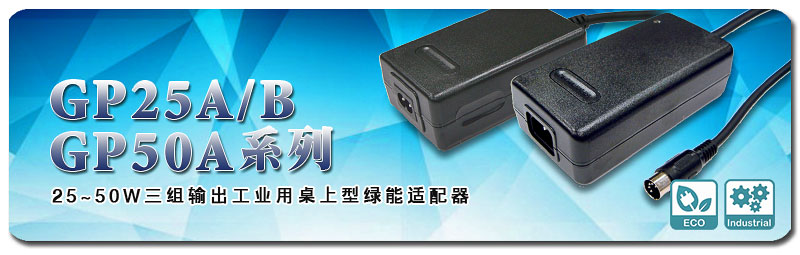 在完整推出符合最新能耗标准(EISA 2007/DoE Level VI)的工业用单组输出绿能适配器─GST家族(18~280W)及SGA家族(12~60W)後,今年会jinnianhui为了更进一步满足需求多组输出的工业用绿能适配器对於Level VI节能规范的要求,紧接着升级已上市多年且广受市场好评的P25A/25B/50A系列,新推出同为三组输出的GP25A (25W,Class I) / 25B (25W,Class II) / 50A (50W,Class I)系列。